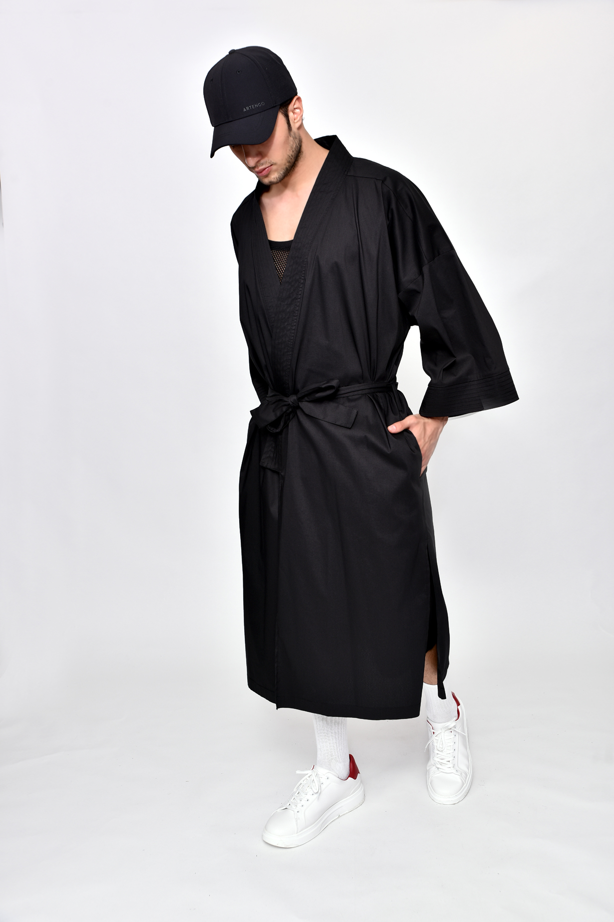 ARKASI BASKILI UZUN SIYAH UNISEX KIMONO % 100 PAMUKLU POPLIN KUMAS